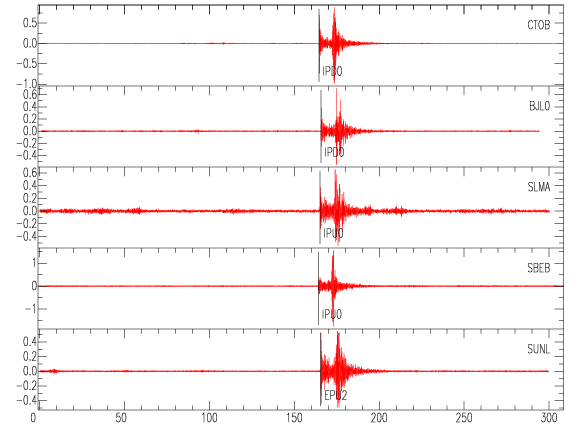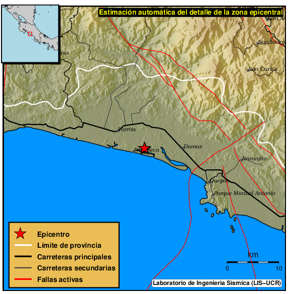 Mapa del epicentro: Los triángulos verdes son las estaciones acelerográficas usadas para calcular el epicentro que se muestra como un punto amarillo. El detalle de la magnitud y distancia a San José se muestra en el cuadro inserto en el mapa.