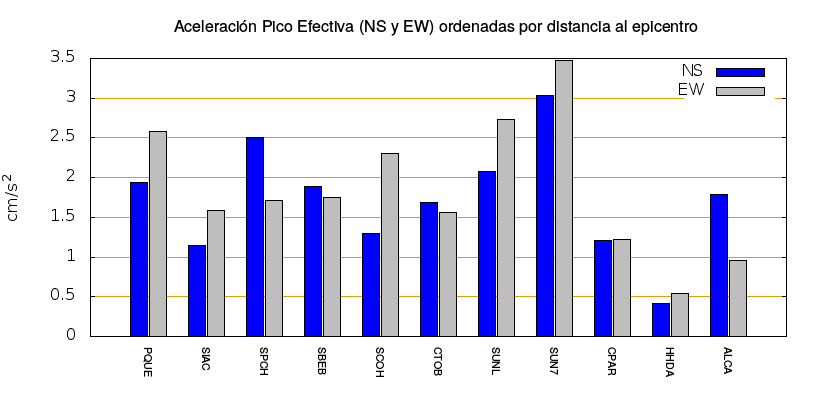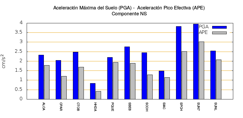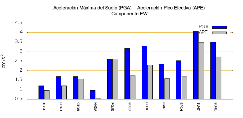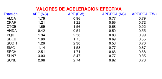 La siguiente tabla muestra los valores de aceleración efectiva para las componentes norte-sur (NS) y este-oeste (EW). También se muestra el valor del cociente entre la aceleración efectiva y la aceleración máxima (APE/PGA).