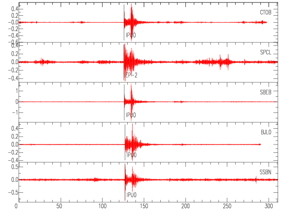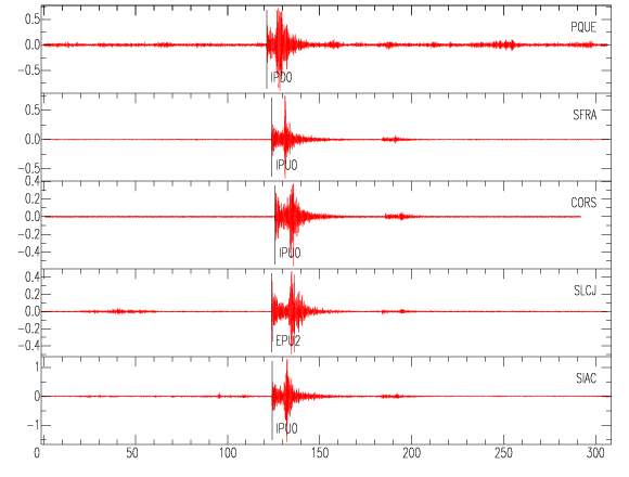 Mapa del epicentro: Los triángulos verdes son las estaciones acelerográficas usadas para calcular el epicentro que se muestra como un punto amarillo. El detalle de la magnitud y distancia a San José se muestra en el cuadro inserto en el mapa.