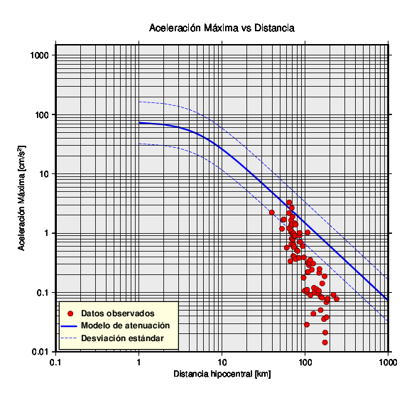 Datos del valor de la aceleración máxima (PGA por sus siglas en inglés) de cada estación (puntos rojos) en función de la distancia al hipocentro. Las trazas azules corresponden al modelo de atenuación y su respectiva desviación estándar.