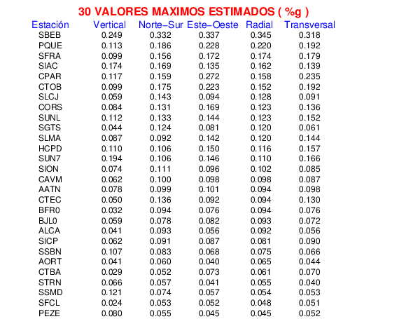 La siguiente tabla muestra los datos de aceleración máxima para cada componente en porcentaje de la aceleración de la gravedad (%g). Estos se obtienen dividiendo el valor del PGA registrado por 980 cm/s2 y multiplicándolo por 100. Los valores de las últimas dos columnas corresponden a la componente radial y transversal. Los datos se listan en orden descendente según el valor de la componente radial.