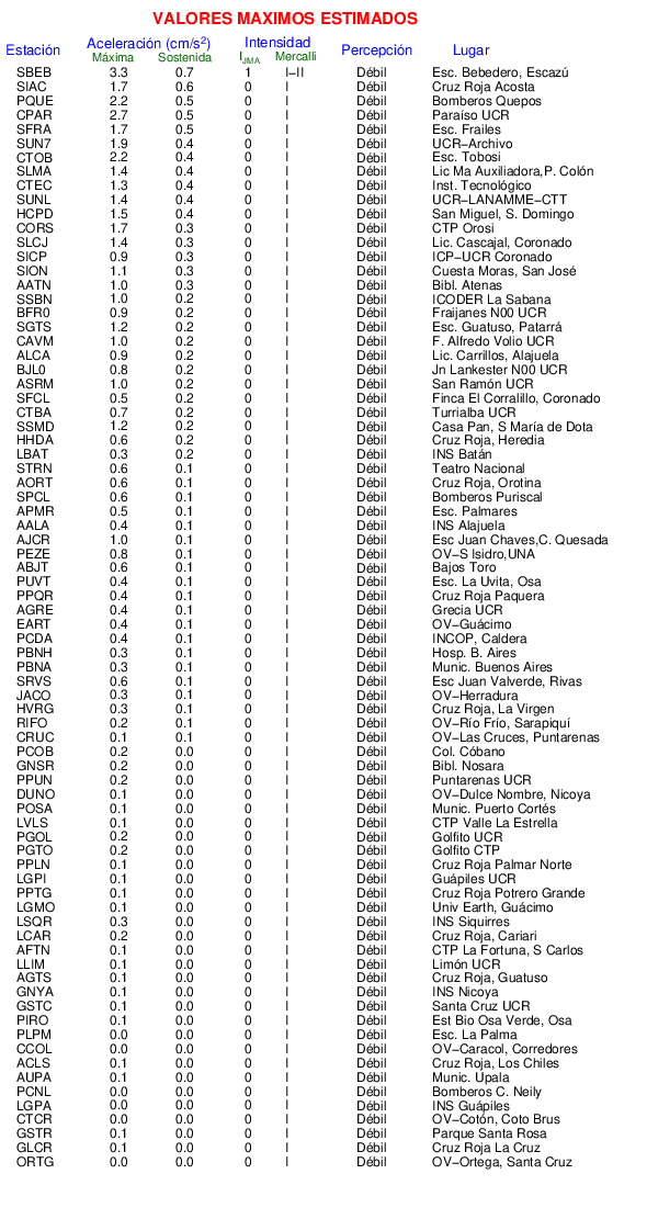 La siguiente tabla muestra los valores de Aceleración Máxima o aceleración pico (PGA por sus siglas en inglés). Este es el valor máximo en cualquiera de las 3 componentes del registro.