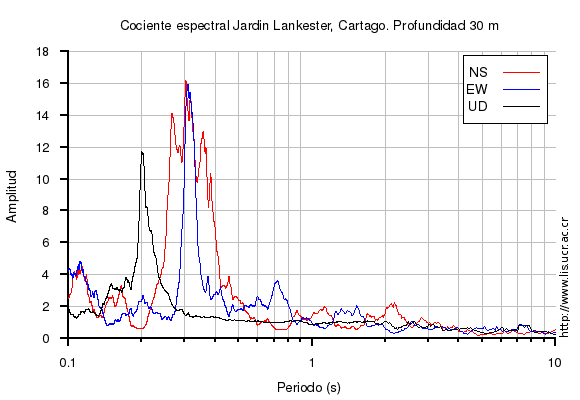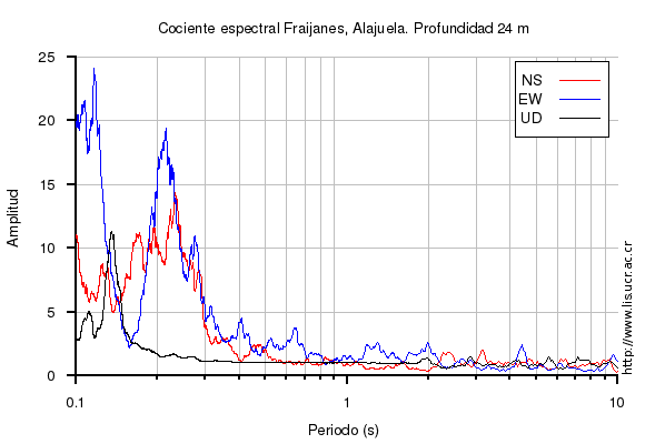 El cociente espectral se obtuvo dividiendo el espectro de amplitud de la componente en superficie con respecto a la componente en profundidad (NS=norte-sur, EW=este-oeste, UD=vertical)
