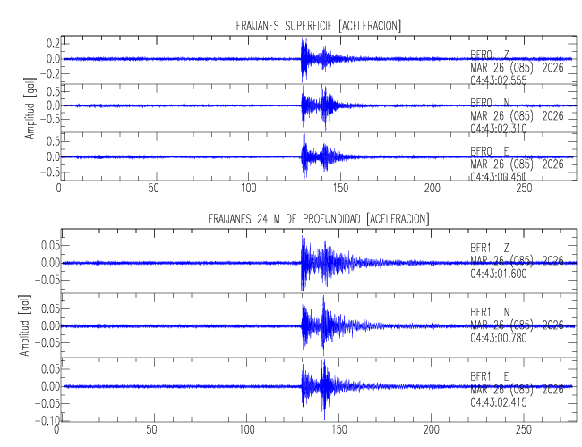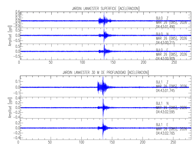 Aquí se muestran las formas de onda y cocientes espectrales de los sensores colocados en pozo . Uno se ubica en el Jardín Lankester en Paraíso de Cartago con 30 m de profundidad y el otro en la Estación Experimental Fabio Baudrit en Alajuela con 40 m de profundidad. La tabla muestra los valores de aceleración máxima (PGA) leídos de las tres componentes en superficie (N00) y en profundidad (N01)