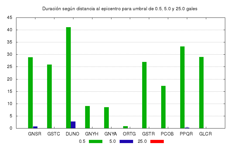 La duración para otros niveles de aceleración también se calculó. Este es el gráfico con los valores de duración para umbrales de 0.5, 5.0 y 25.0 gales. Se muestran los 10 primeros sitios ordenados por su cercanía el epicentro.