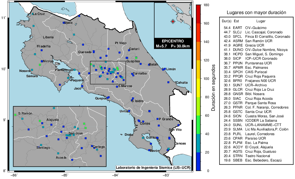 Este mapa muestra la duración en cada sitio de registro del LISUCR. Este parámetro se calculó sumando el tiempo que la amplitud del registro se mantuvo por encima de 0.5 cm/2. La tabla detalla el valor de los primeros 30 sitios con el código de la estación y el nombre del lugar donde se ubica.