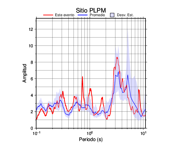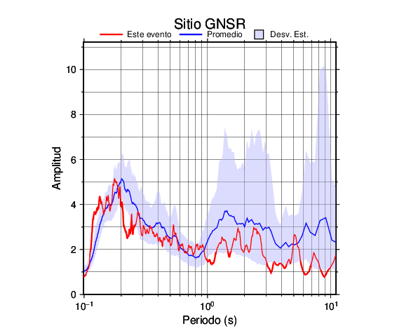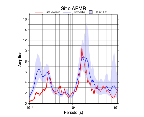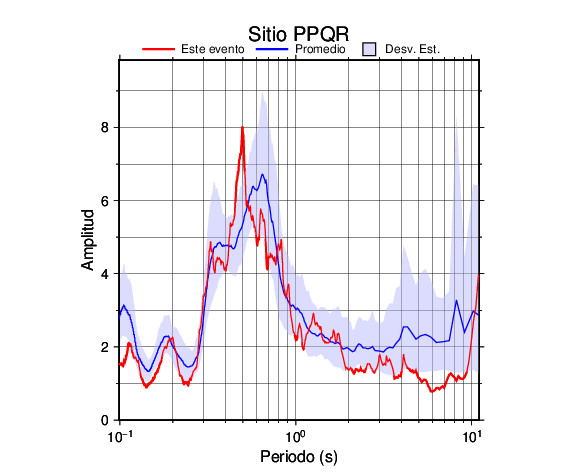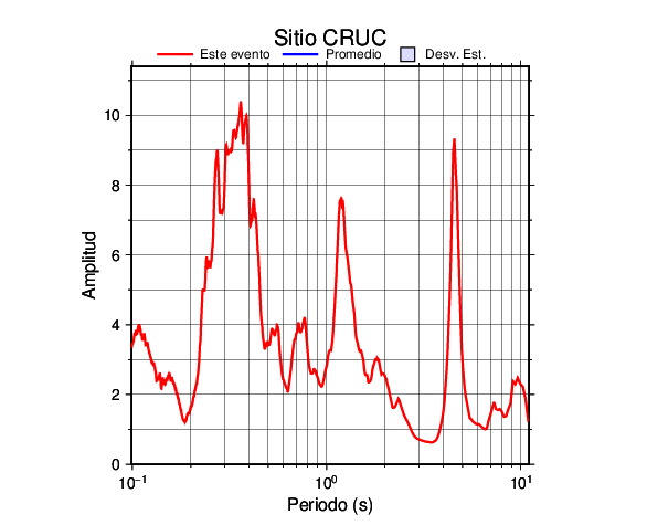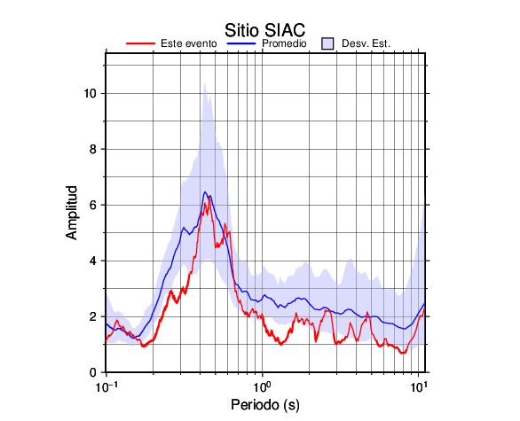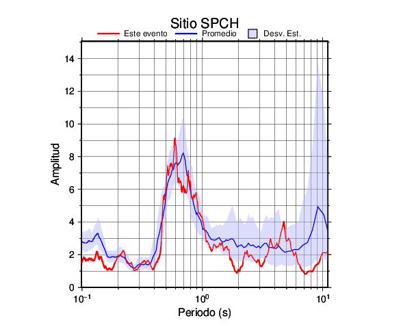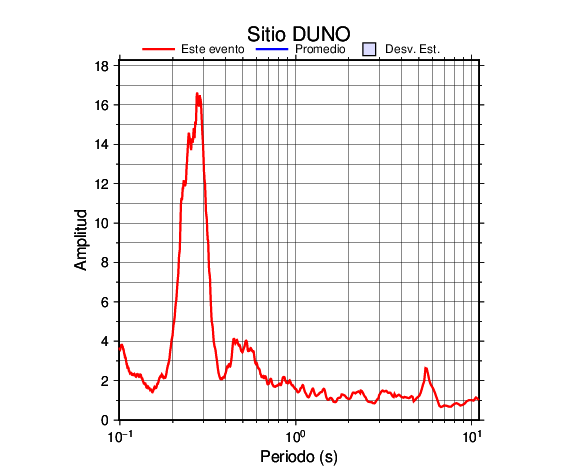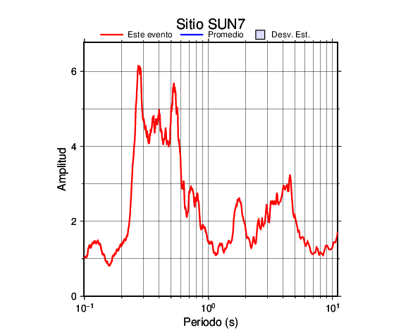 Los resultados que se presentan aquí fueron obtenidos luego de dividir las componentes horizontales entre la componente vertical (conocido como técnica H/V). Se grafica tanto el efecto de sitio del sismo registrado como el valor promedio en cada estación y su correspondiente desviación estándar.