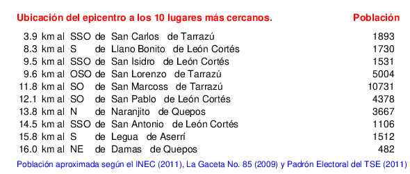 Detalle de la zona epicentral:. Se muestran los poblados más cercanos al epicentro en un radio de unos 30 km. Las principales fallas activas son las trazas de color rojo. Abajo están las distancias que hay del epicentro a cada uno de los diez sitios más cercanos y la cantidad de habitantes que poseen.