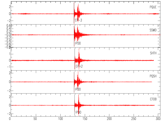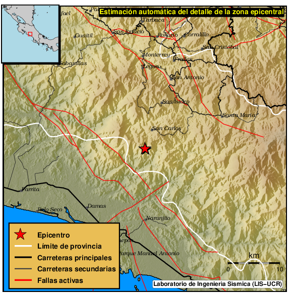 Mapa del epicentro: Los triángulos verdes son las estaciones acelerográficas usadas para calcular el epicentro que se muestra como un punto amarillo. El detalle de la magnitud y distancia a San José se muestra en el cuadro inserto en el mapa.