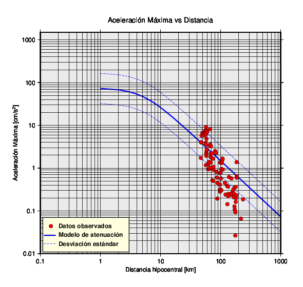 Datos del valor de la aceleración máxima (PGA por sus siglas en inglés) de cada estación (puntos rojos) en función de la distancia al hipocentro. Las trazas azules corresponden al modelo de atenuación y su respectiva desviación estándar.