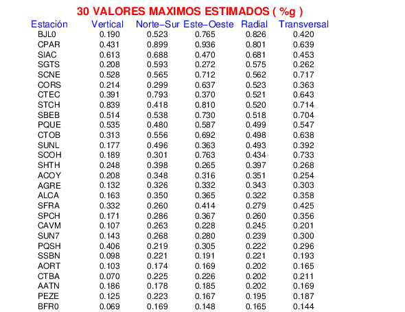 La siguiente tabla muestra los datos de aceleración máxima para cada componente en porcentaje de la aceleración de la gravedad (%g). Estos se obtienen dividiendo el valor del PGA registrado por 980 cm/s2 y multiplicándolo por 100. Los valores de las últimas dos columnas corresponden a la componente radial y transversal. Los datos se listan en orden descendente según el valor de la componente radial.