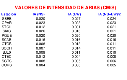 En esta sección se muestra el cáculo de la IA para la componente norte-sur (NS) y este-oeste (EW) de los registros de aceleración que tuvieron valores superiores a los 5 cm/s2, así como el valor total de esta que corresponde al promedio de ambas componentes horizontales.