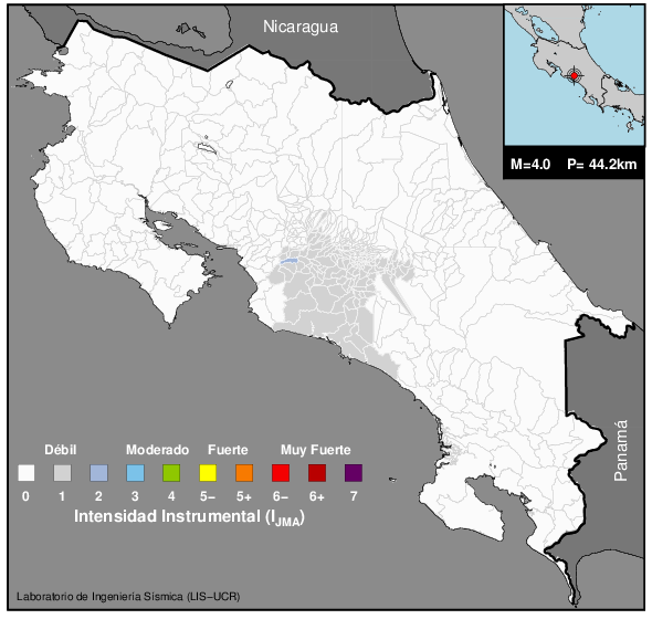 Este mapa muestra la división política de Costa Rica a nivel de distritos. Según nuestros cálculos, la intensidad de grado 2 o superior en la escala de JMA (que varía de 0 a 7) afectó un total de 1 distritos. La lista de estos se muestra bajo del mapa en orden alfabético.