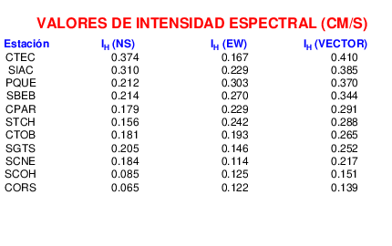 En esta sección se muestra el cáculo de la intensidad de Housner, IH para la componente norte-sur (NS) y este-oeste (EW) y la suma vectorial de los registros de aceleración que tuvieron valores superiores a los 5 cm/s2.