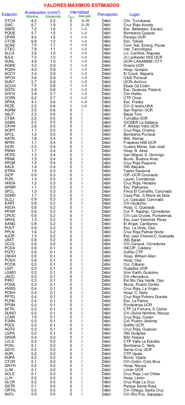 La siguiente tabla muestra los valores de Aceleración Máxima o aceleración pico (PGA por sus siglas en inglés). Este es el valor máximo en cualquiera de las 3 componentes del registro.