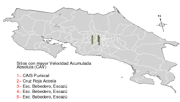 La velocidad acumulada absoluta (CAV por sus siglas en inglés) es otro parámetro que se usa para caracterizar el movimiento fuerte del suelo. Los datos están dados en cm/s para las componentes norte-sur (NS) y este-oeste (EW). El máximo de ambas se da en la tercera columna.