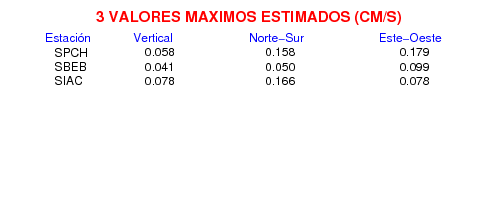 Los registros de velocidad se obtienen de la integración de los datos de aceleración. Esta tabla contiene los valores de velocidad máxima (PGV por sus siglas en inglés) para cada componente en cm/s. Las estaciones se listan en orden alfabético y corresponden a los sitios en que el nivel de aceleración fue superior a los 5 cm/s2.
