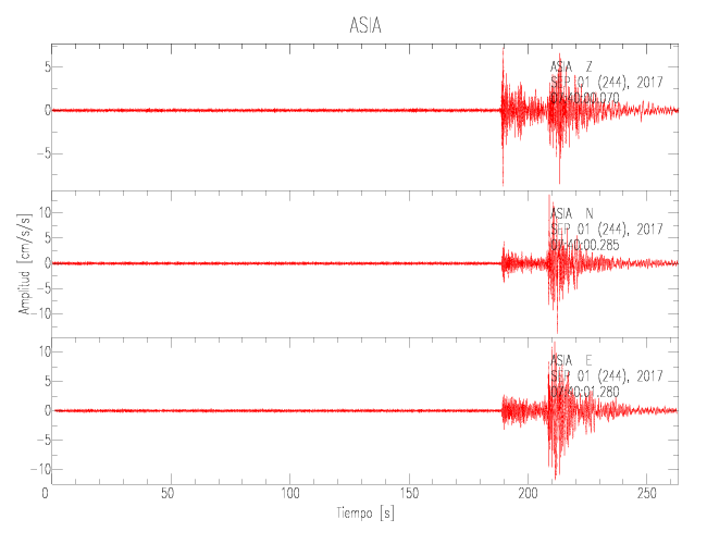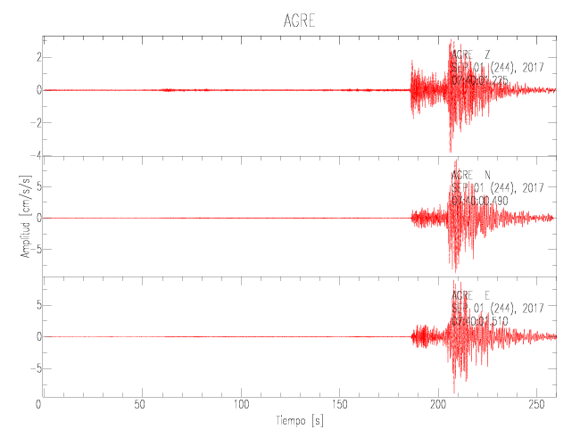 La siguiente tabla muestra los datos de aceleración máxima para cada componente en porcentaje de la aceleración de la gravedad (%g). Estos se obtienen dividiendo el valor del PGA registrado por 980 cm/s2 y multiplicándolo por 100. Las estaciones se listan en orden alfabético. Los valores de las últimas dos columnas corresponden a la componente radial y transversal.