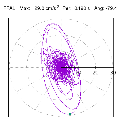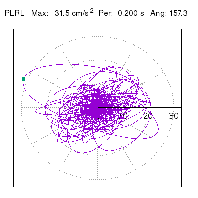 Tomando el periodo en el cual se presenta la amplitud máxima del espectro de respuesta máxima para cada estación, se representa la respuesta bidireccional en función del tiempo sobre el plano horizontal. Se identifica el punto (color verde en cada figura) del cual se desprende la orientación mostrada en el mapa de la sección superior. El valor de la acelereración máxima corresponde al punto del espectro de respuesta para el periodo indicado.