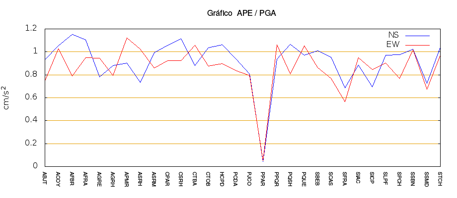 La siguiente tabla muestra los valores de aceleración efectiva para las componentes norte-sur (NS) y este-oeste (EW). También se muestra el valor del cociente entre la aceleración efectiva y la aceleración máxima (APE/PGA).