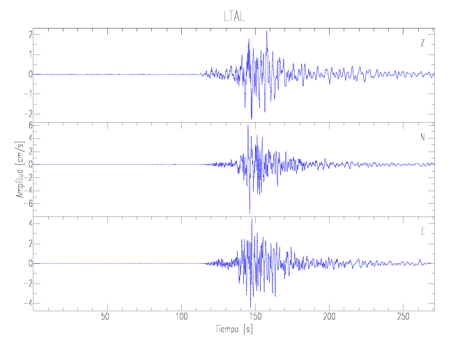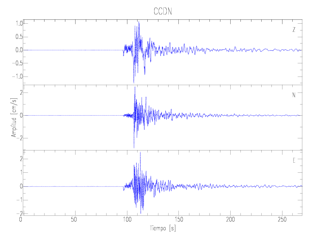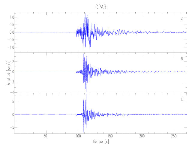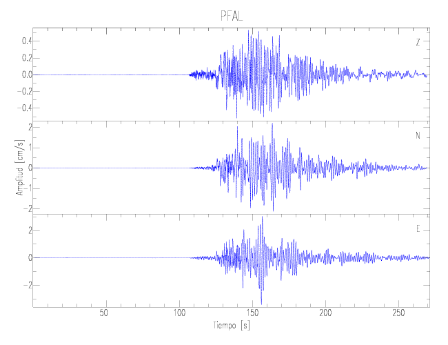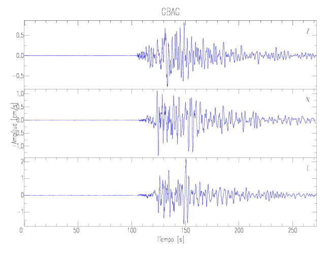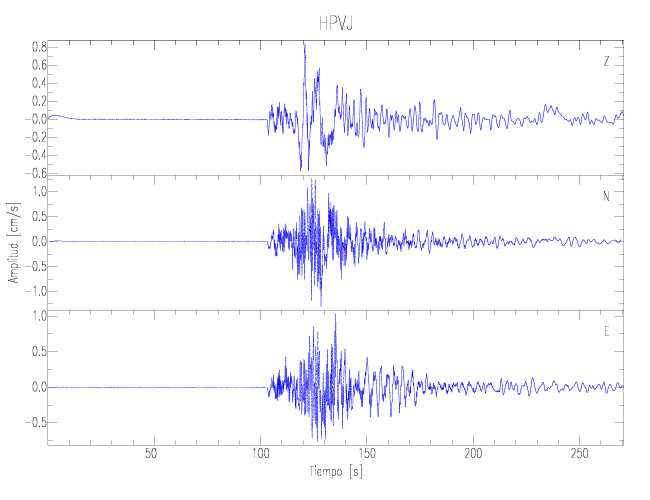 Los registros de velocidad se obtienen de la integración de los datos de aceleración. Esta tabla contiene los valores de velocidad máxima (PGV por sus siglas en inglés) para cada componente en cm/s. Las estaciones se listan en orden alfabético y corresponden a los sitios en que el nivel de aceleración fue superior a los 5 cm/s2.