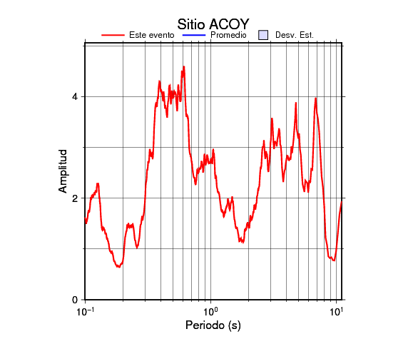 Los resultados que se presentan aquí fueron obtenidos luego de dividir las componentes horizontales entre la componente vertical (conocido como técnica H/V). Se grafica tanto el efecto de sitio del sismo registrado como el valor promedio en cada estación y su correspondiente desviación estándar.