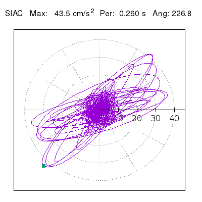 Tomando el periodo en el cual se presenta la amplitud máxima del espectro de respuesta máxima para cada estación, se representa la respuesta bidireccional en función del tiempo sobre el plano horizontal. Se identifica el punto (color verde en cada figura) del cual se desprende la orientación mostrada en el mapa de la sección superior. El valor de la acelereración máxima corresponde al punto del espectro de respuesta para el periodo indicado.