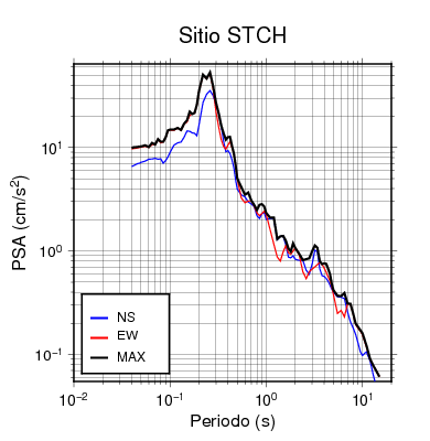Los espectros de respuesta máxima siempre serán mayores o iguales a los espectros en las direcciones N-S y E-O. Se muestra la comparación para cada una de las estaciones en que se registró el evento.