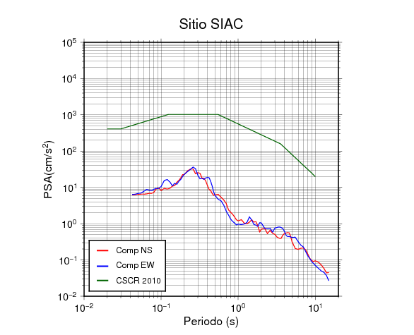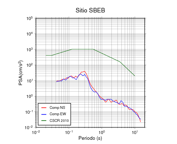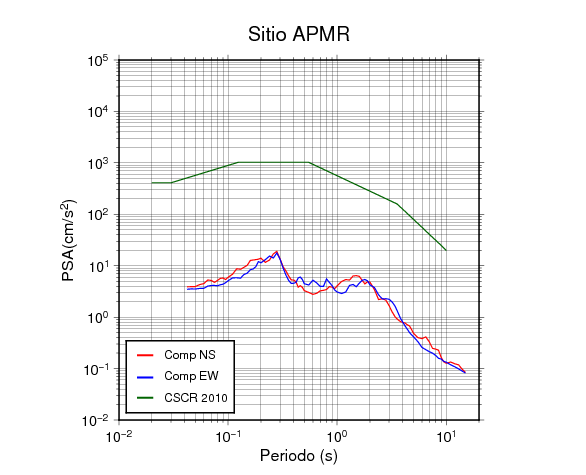 En los siguientes gráficos, la traza verde es el espectro propuesto por el CSCR-2010, la traza roja es el espectro de este sismo en la componente norte-sur (NS) y la traza azul la componente este-oeste (EW). El valor de la amplitud está dado en pseudoaceleración en cm/s2.