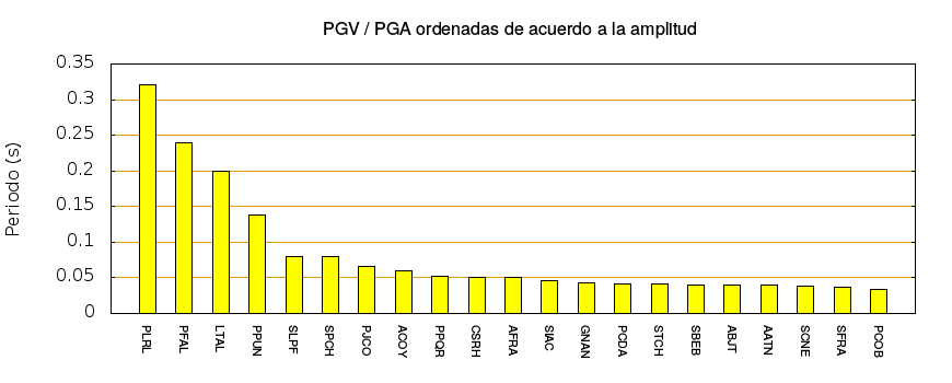 El cociente de la velocidad máxima (PGV) entre la aceleración máxima (PGA) brinda información de los periodos más significativos del movimiento del suelo. En el gráfico siguiente se muestran las estaciones ordenadas por su cercanía al epicentro. La más cercana está a la izquierda y la más lejana a la derecha. También se muestran los mismos datos en orden alfabético y ordenados de mayor a menor amplitud.