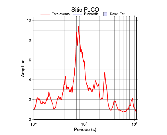 Los resultados que se presentan aquí fueron obtenidos luego de dividir las componentes horizontales entre la componente vertical (conocido como técnica H/V). Se grafica tanto el efecto de sitio del sismo registrado como el valor promedio en cada estación y su correspondiente desviación estándar.