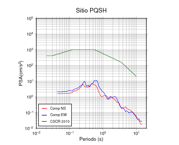 En los siguientes gráficos, la traza verde es el espectro propuesto por el CSCR-2010, la traza roja es el espectro de este sismo en la componente norte-sur (NS) y la traza azul la componente este-oeste (EW). El valor de la amplitud está dado en pseudoaceleración en cm/s2.