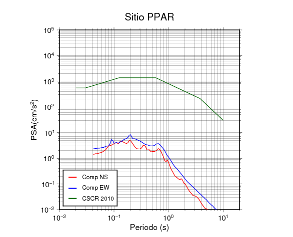 En los siguientes gráficos, la traza verde es el espectro propuesto por el CSCR-2010, la traza roja es el espectro de este sismo en la componente norte-sur (NS) y la traza azul la componente este-oeste (EW). El valor de la amplitud está dado en pseudoaceleración en cm/s2.