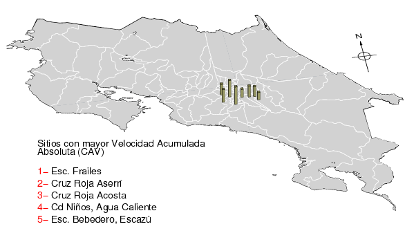 La velocidad acumulada absoluta (CAV por sus siglas en inglés) es otro parámetro que se usa para caracterizar el movimiento fuerte del suelo. Los datos están dados en cm/s para las componentes norte-sur (NS) y este-oeste (EW). El máximo de ambas se da en la tercera columna.