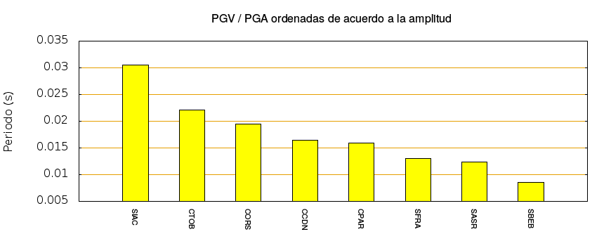 El cociente de la velocidad máxima (PGV) entre la aceleración máxima (PGA) brinda información de los periodos más significativos del movimiento del suelo. En el gráfico siguiente se muestran las estaciones ordenadas por su cercanía al epicentro. La más cercana está a la izquierda y la más lejana a la derecha. También se muestran los mismos datos en orden alfabético y ordenados de mayor a menor amplitud.