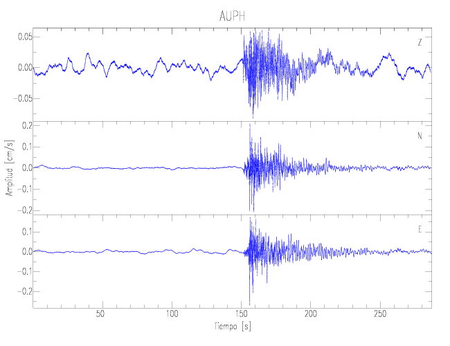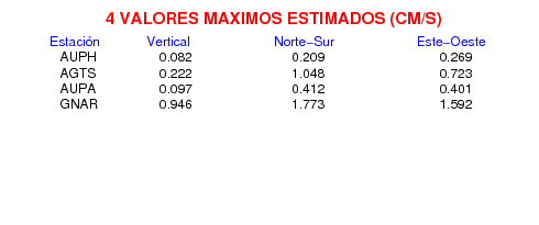 Los registros de velocidad se obtienen de la integración de los datos de aceleración. Esta tabla contiene los valores de velocidad máxima (PGV por sus siglas en inglés) para cada componente en cm/s. Las estaciones se listan en orden alfabético y corresponden a los sitios en que el nivel de aceleración fue superior a los 5 cm/s2.