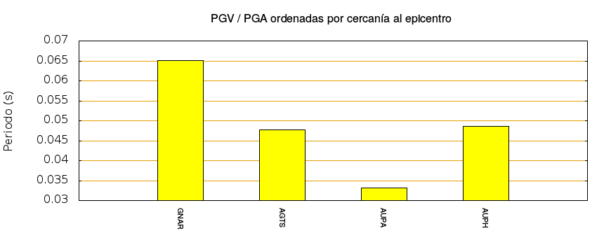 El cociente de la velocidad máxima (PGV) entre la aceleración máxima (PGA) brinda información de los periodos más significativos del movimiento del suelo. En el gráfico siguiente se muestran las estaciones ordenadas por su cercanía al epicentro. La más cercana está a la izquierda y la más lejana a la derecha. También se muestran los mismos datos en orden alfabético y ordenados de mayor a menor amplitud.