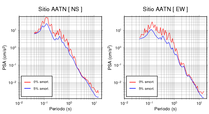 Las construcciones civiles generalmente poseen niveles de amortiguamiento en el rango de 2 a 7%. Para edificaciones normales, se asume que es de 5%. Esta tabla contiene los valores de PSA en cm/s2 calculados del espectro de respuesta con 5% de amortiguamiento a 1 segundo (se muestran los valores para aquellas estaciones que tuvieron un valor de aceleración superior a 5 cm/s2).