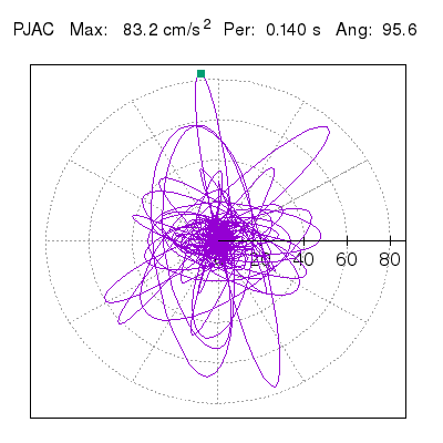 Tomando el periodo en el cual se presenta la amplitud máxima del espectro de respuesta máxima para cada estación, se representa la respuesta bidireccional en función del tiempo sobre el plano horizontal. Se identifica el punto (color verde en cada figura) del cual se desprende la orientación mostrada en el mapa de la sección superior. El valor de la acelereración máxima corresponde al punto del espectro de respuesta para el periodo indicado.