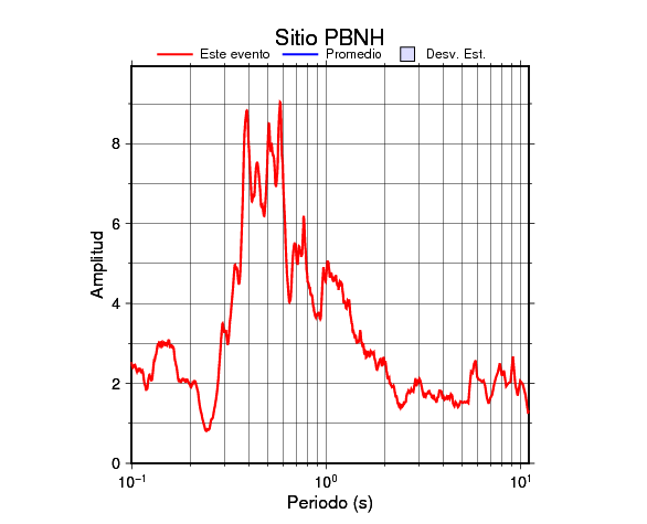 Los resultados que se presentan aquí fueron obtenidos luego de dividir las componentes horizontales entre la componente vertical (conocido como técnica H/V). Se grafica tanto el efecto de sitio del sismo registrado como el valor promedio en cada estación y su correspondiente desviación estándar.