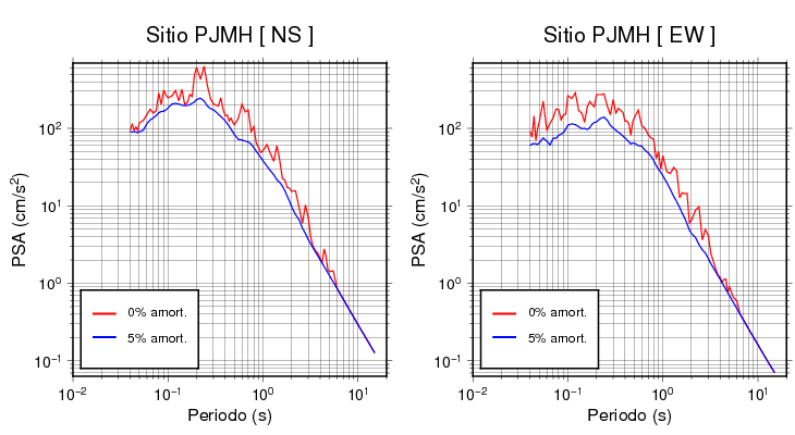 Las construcciones civiles generalmente poseen niveles de amortiguamiento en el rango de 2 a 7%. Para edificaciones normales, se asume que es de 5%. Esta tabla contiene los valores de PSA en cm/s2 calculados del espectro de respuesta con 5% de amortiguamiento a 1 segundo (se muestran los valores para aquellas estaciones que tuvieron un valor de aceleración superior a 5 cm/s2).