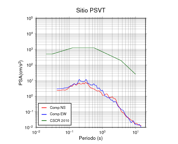 En los siguientes gráficos, la traza verde es el espectro propuesto por el CSCR-2010, la traza roja es el espectro de este sismo en la componente norte-sur (NS) y la traza azul la componente este-oeste (EW). El valor de la amplitud está dado en pseudoaceleración en cm/s2.