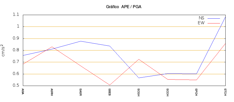 La siguiente tabla muestra los valores de aceleración efectiva para las componentes norte-sur (NS) y este-oeste (EW). También se muestra el valor del cociente entre la aceleración efectiva y la aceleración máxima (APE/PGA).