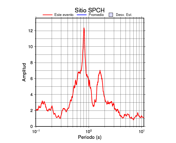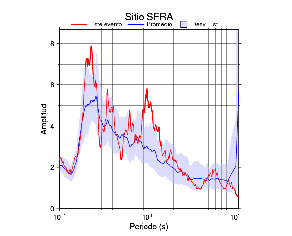 Los resultados que se presentan aquí fueron obtenidos luego de dividir las componentes horizontales entre la componente vertical (conocido como técnica H/V). Se grafica tanto el efecto de sitio del sismo registrado como el valor promedio en cada estación y su correspondiente desviación estándar.