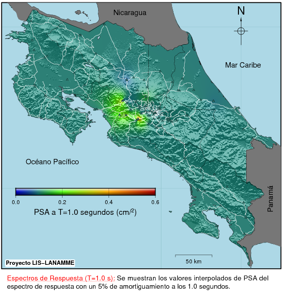 La siguiente figura corresponde al mapa interpolado de los valores de los espectros de respuesta para 1.0 s en período. La escala muestra los valores de pseudoaceleración con los valores bajos en azul y los altos en rojo. Los triángulos corresponden a la ubicación de los acelerógrafos.
