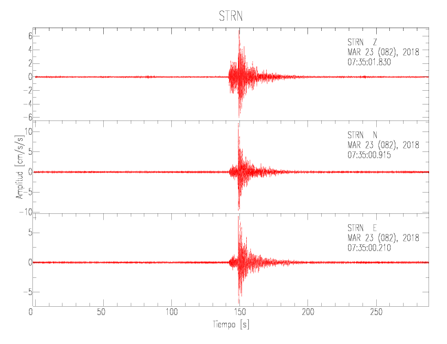 La siguiente tabla muestra los datos de aceleración máxima para cada componente en porcentaje de la aceleración de la gravedad (%g). Estos se obtienen dividiendo el valor del PGA registrado por 980 cm/s2 y multiplicándolo por 100. Las estaciones se listan en orden alfabético. Los valores de las últimas dos columnas corresponden a la componente radial y transversal.