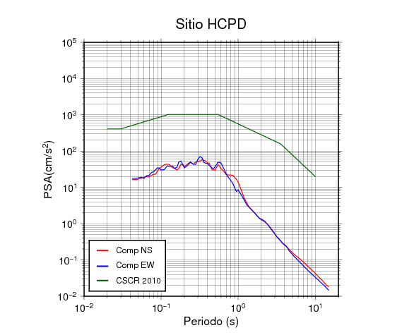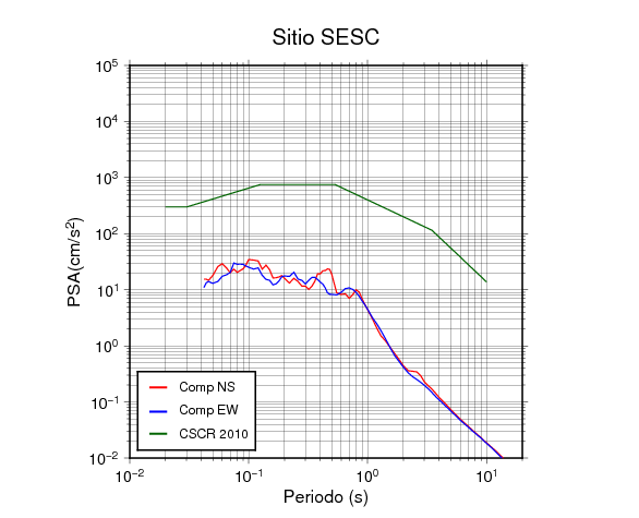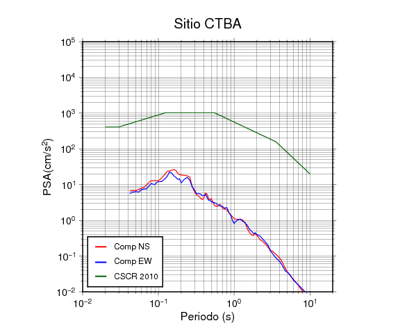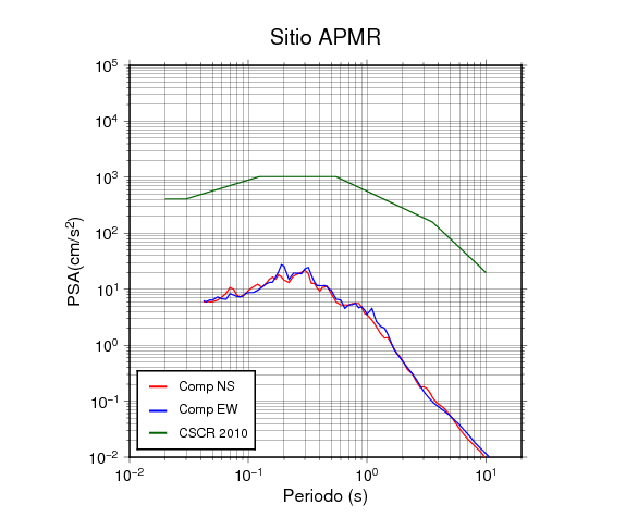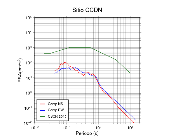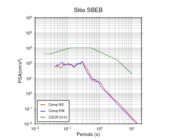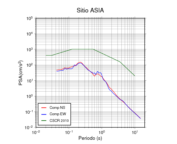 En los siguientes gráficos, la traza verde es el espectro propuesto por el CSCR-2010, la traza roja es el espectro de este sismo en la componente norte-sur (NS) y la traza azul la componente este-oeste (EW). El valor de la amplitud está dado en pseudoaceleración en cm/s2.