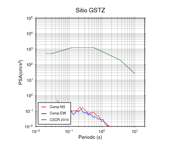 En los siguientes gráficos, la traza verde es el espectro propuesto por el CSCR-2010, la traza roja es el espectro de este sismo en la componente norte-sur (NS) y la traza azul la componente este-oeste (EW). El valor de la amplitud está dado en pseudoaceleración en cm/s2.