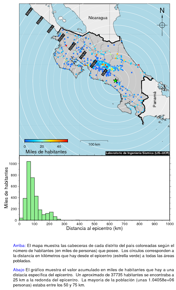 Este mapa muestra la ubicación del epicentro y la cantidad de habitantes que se encontraban a una cierta distancia de este. Los intervalos son de 25 km.