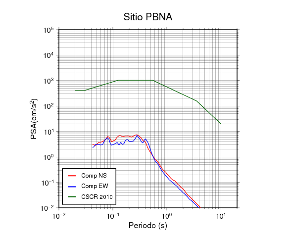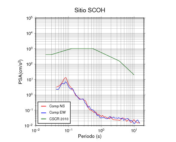 En los siguientes gráficos, la traza verde es el espectro propuesto por el CSCR-2010, la traza roja es el espectro de este sismo en la componente norte-sur (NS) y la traza azul la componente este-oeste (EW). El valor de la amplitud está dado en pseudoaceleración en cm/s2.